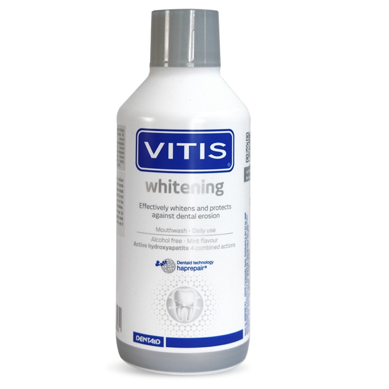 Завдяки своїй унікальній комбінованій формулі ополіскувач VITIS WHITENING (ВІТІС ВАЙТЕНІН) ефективно відбілює зуби, відновлюючи їх натуральну білизну та яскравість. Водночас жодним чином не ушкоджуює тканини зубів, навіть більше — зміцнює емаль і запобігають виникненню чутливості.